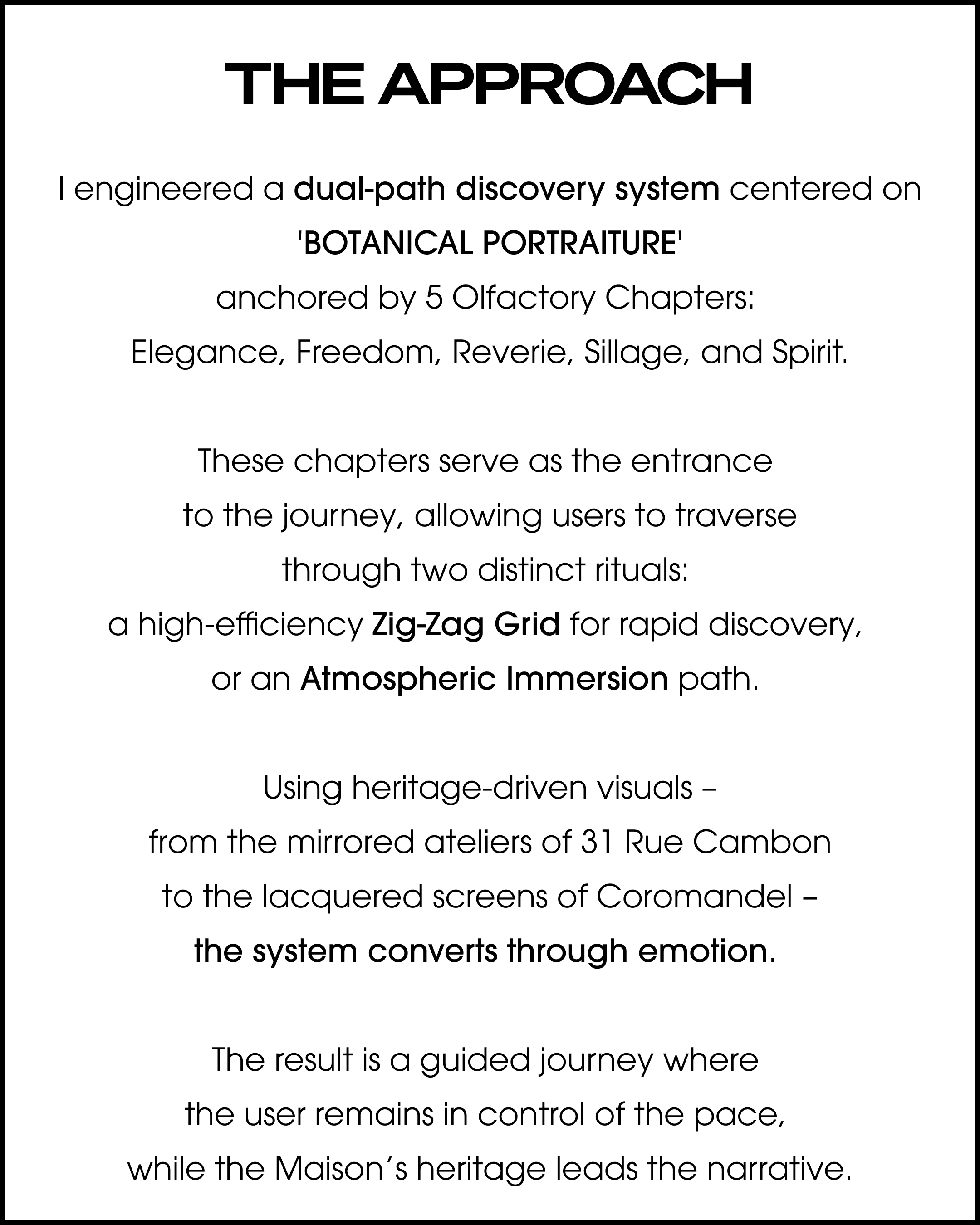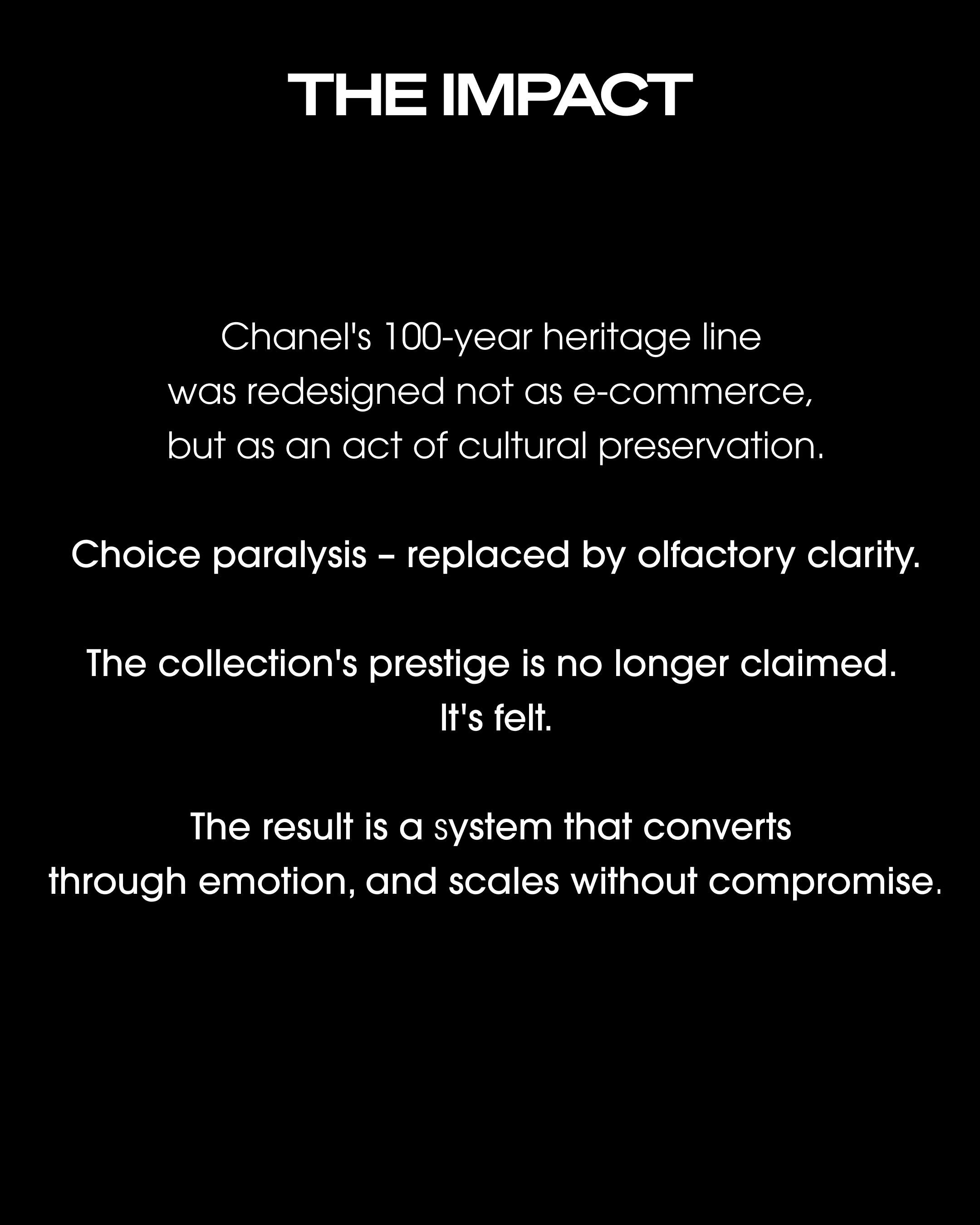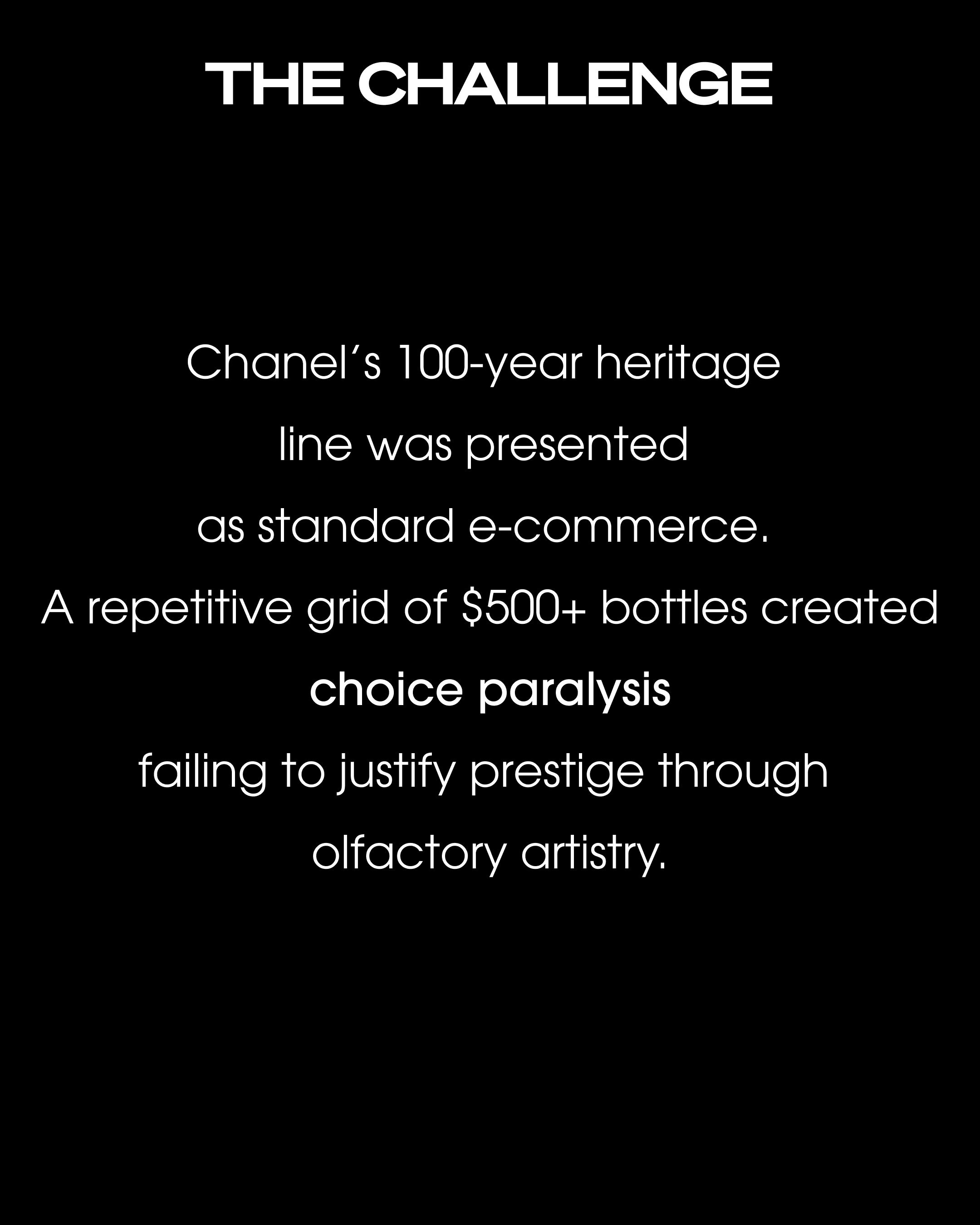 LES EXCLUSIFS DE CHANEL is equivalent of the Tweed Jacket in CHANEL's fragrance line – deliberately exclusive, intentionally unforced, and built for connoisseurs rather than casual shoppers. Every design decision in this ecosystem was made to protect and amplify that positioning. Where the current digital experience applies standard e-commerce patterns to an extraordinary collection, this redesign sets a single standard: the digital experience must be as exclusive as the product itself.