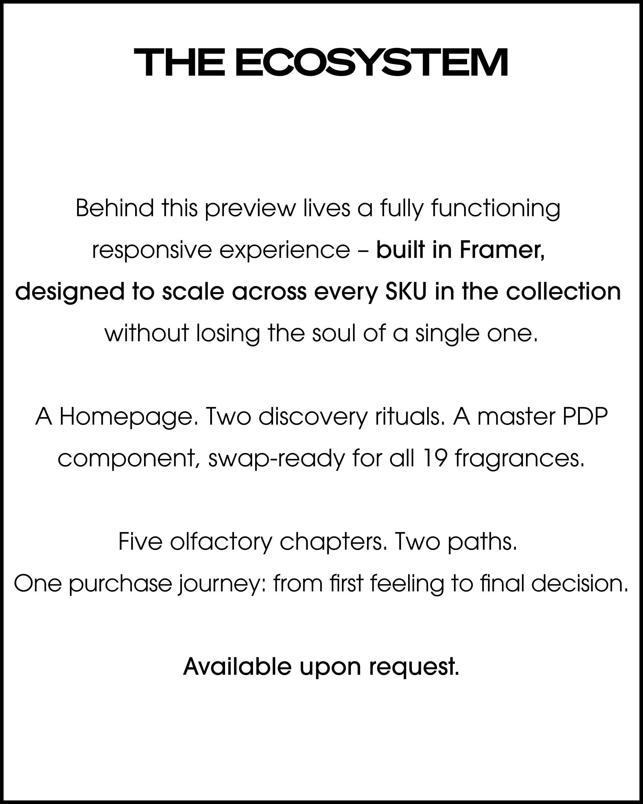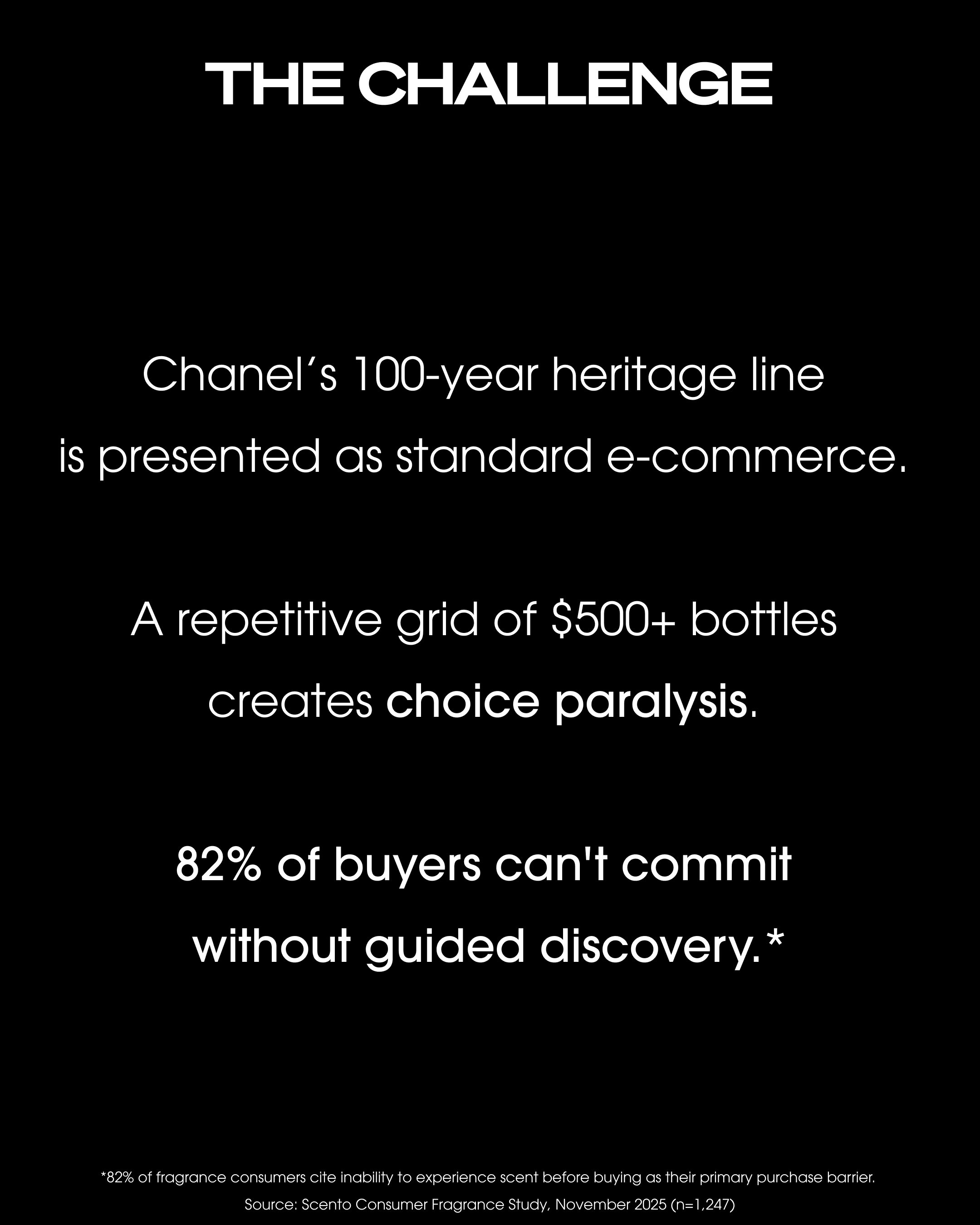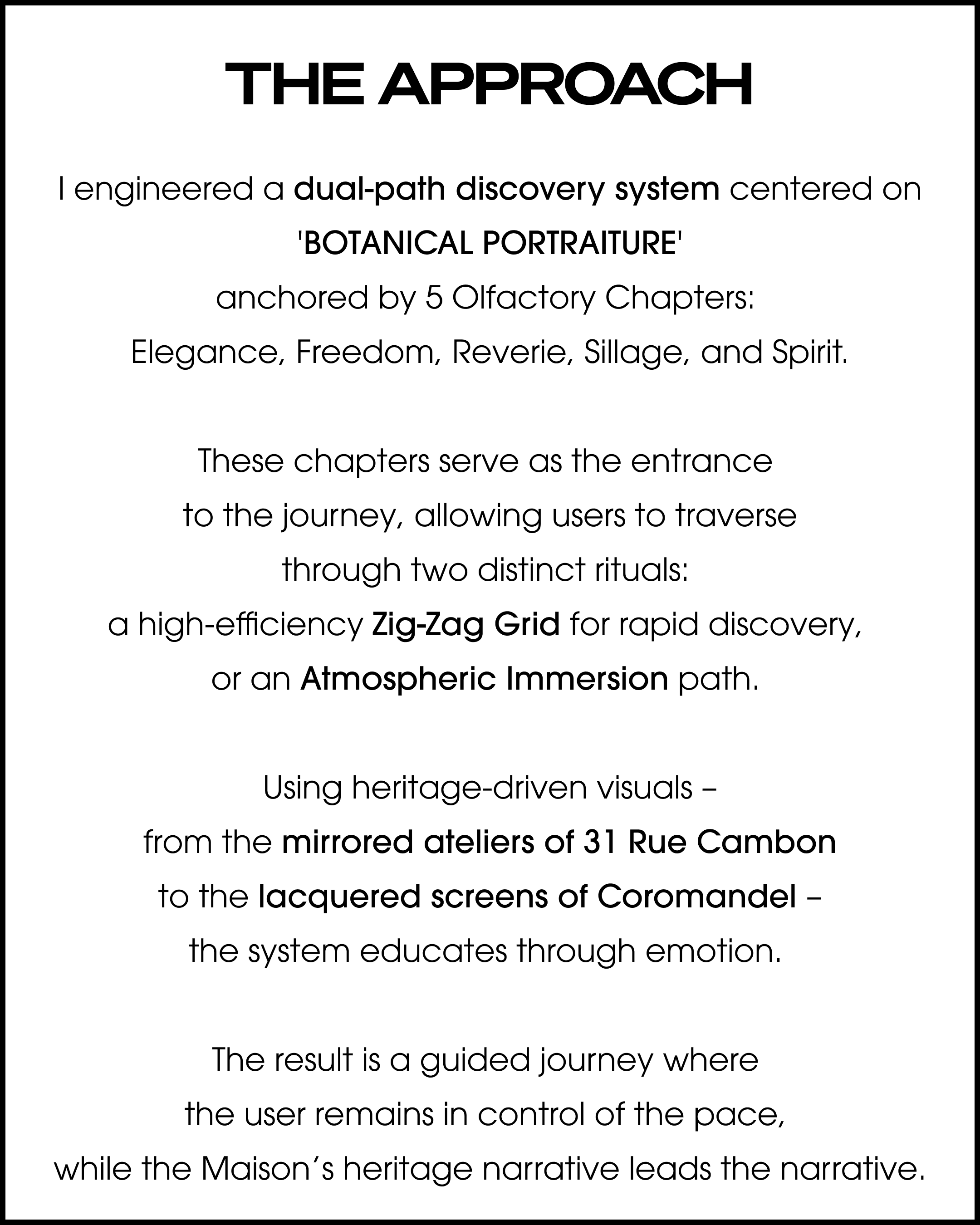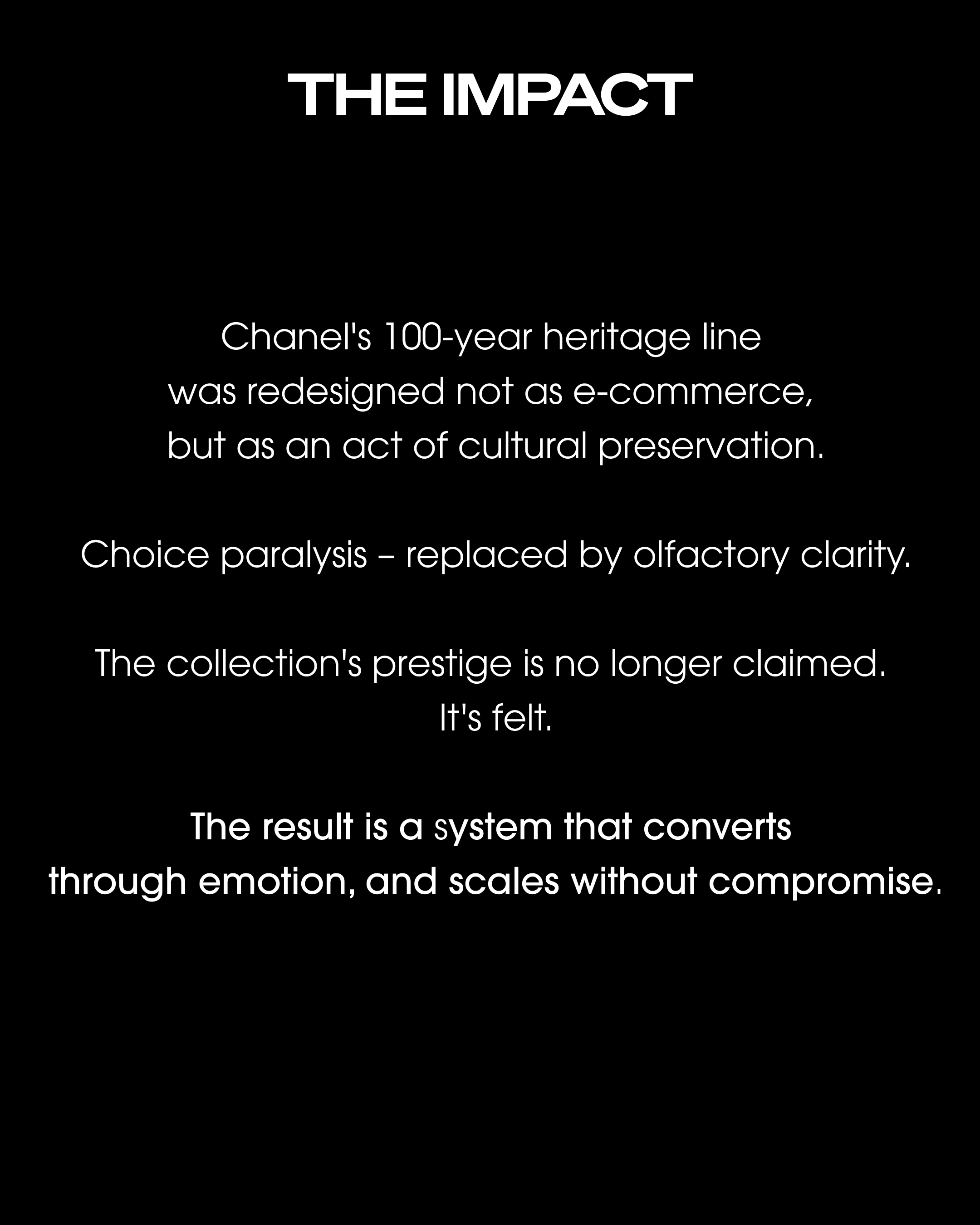 LES EXCLUSIFS DE CHANEL is equivalent of the Tweed Jacket in CHANEL's fragrance line – deliberately exclusive, intentionally unforced, and built for connoisseurs rather than casual shoppers. Every design decision in this ecosystem was made to protect and amplify that positioning. Where the current digital experience applies standard e-commerce patterns to an extraordinary collection, this redesign sets a single standard: the digital experience must be as exclusive as the product itself.